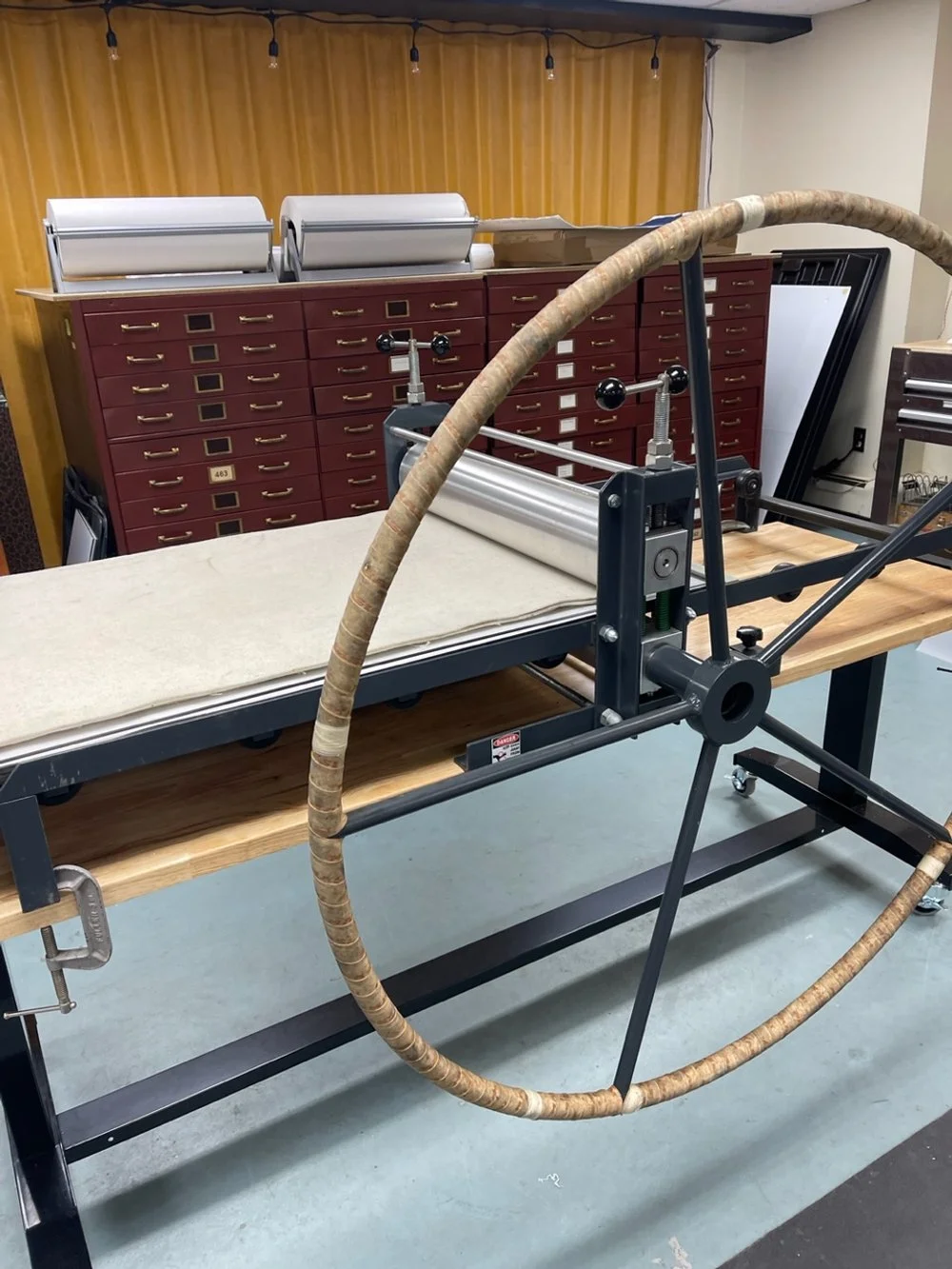 For monoprint, drypoint, etching*, and lithography* we have a Tackach 34” x 60” floor model combination press. (Set up as an etching press)